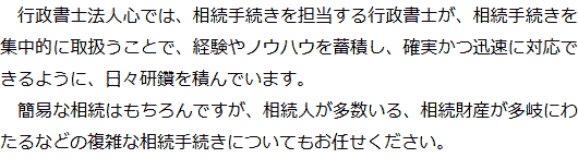 1 相続手続きを集中的に取扱う行政書士が担当! 2 行政書士法人心とグループ企業が連携して相続をトータルサポート! 3 お客様相談室を設けています! 4 電話・テレビ電話相談でご自宅から気軽に相談! 5 費用についてわかりやすくご説明いたします!
