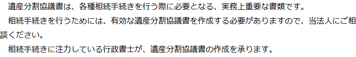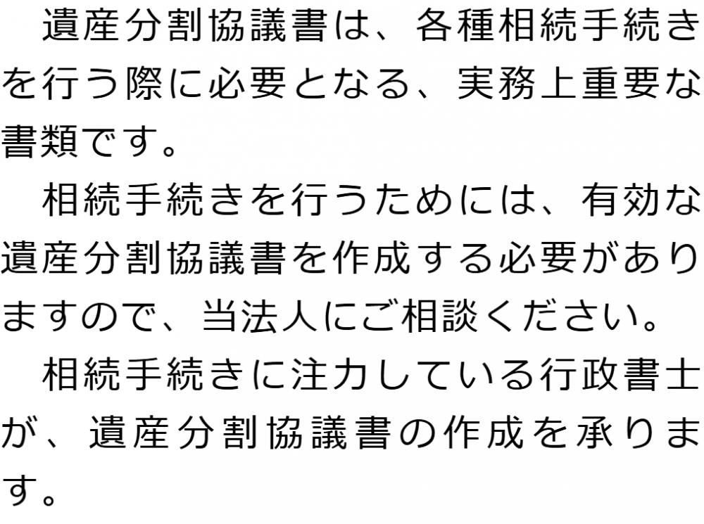 トップ業務内容遺産分割協議書の作成 階層構造▼ 業務内容(目次) 遺産分割協議書の作成 業務内容(目次)業務内容トップ行政書士法人心の業務内容遺言遺産整理相続人調査相続財産調査遺産分割協議書の作成預金・貯金の解約・名義変更証券口座の解約・名義変更自動車の名義変更心グループのその他の業務内容家族信託・民事信託節税対策事業承継遺言の検認相続放棄限定承認遺産分割遺留分侵害額請求相続登記相続税申告相続税調査 受付時間 平日 9時~21時、土日祝 9時~18時 夜間・土日祝の相談も対応します (要予約) 所在地 〒271-0092 千葉県松戸市松戸1281‐29京阪松戸ビル3F 0120-2403-39 お問合せ・アクセス・地図