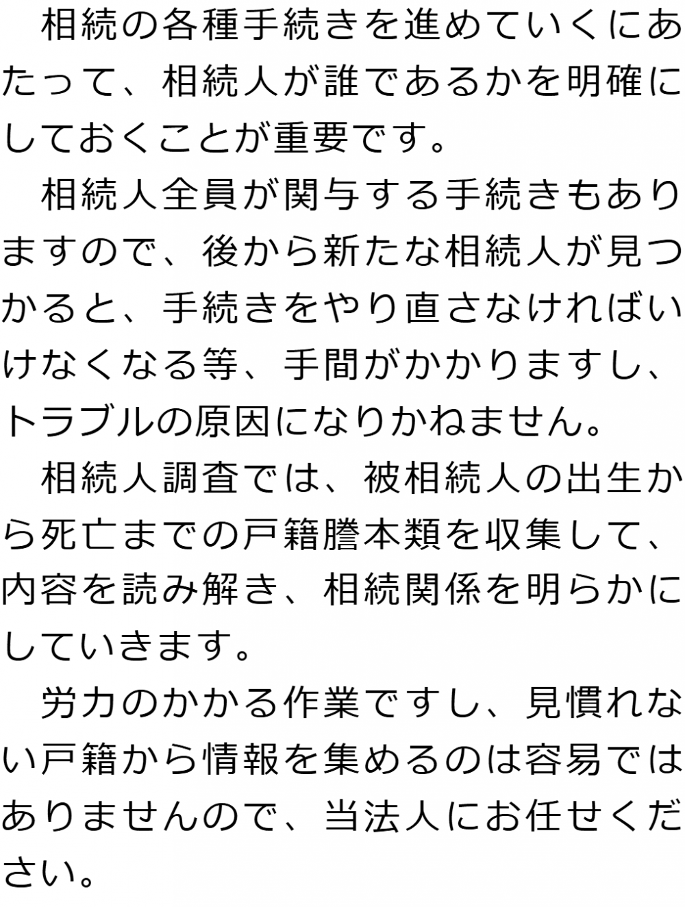 トップ業務内容相続人調査 階層構造▼ 業務内容(目次) 相続人調査 業務内容(目次)業務内容トップ行政書士法人心の業務内容遺言遺産整理相続人調査相続財産調査遺産分割協議書の作成預金・貯金の解約・名義変更証券口座の解約・名義変更自動車の名義変更心グループのその他の業務内容家族信託・民事信託節税対策事業承継遺言の検認相続放棄限定承認遺産分割遺留分侵害額請求相続登記相続税申告相続税調査 受付時間 平日 9時~21時、土日祝 9時~18時 夜間・土日祝の相談も対応します (要予約) 所在地 〒271-0092 千葉県松戸市松戸1281‐29京阪松戸ビル3F 0120-2403-39 お問合せ・アクセス・地図