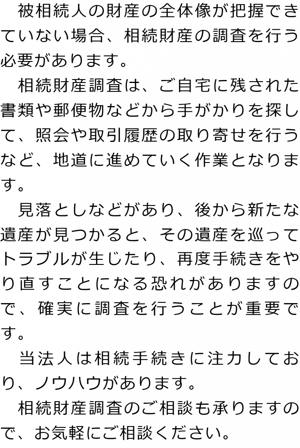 トップ業務内容相続財産調査 階層構造▼ 業務内容(目次) 相続財産調査 業務内容(目次)業務内容トップ行政書士法人心の業務内容遺言遺産整理相続人調査相続財産調査遺産分割協議書の作成預金・貯金の解約・名義変更証券口座の解約・名義変更自動車の名義変更心グループのその他の業務内容家族信託・民事信託節税対策事業承継遺言の検認相続放棄限定承認遺産分割遺留分侵害額請求相続登記相続税申告相続税調査 受付時間 平日 9時~21時、土日祝 9時~18時 夜間・土日祝の相談も対応します (要予約) 所在地 〒271-0092 千葉県松戸市松戸1281‐29京阪松戸ビル3F 0120-2403-39 お問合せ・アクセス・地図