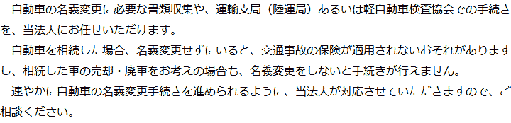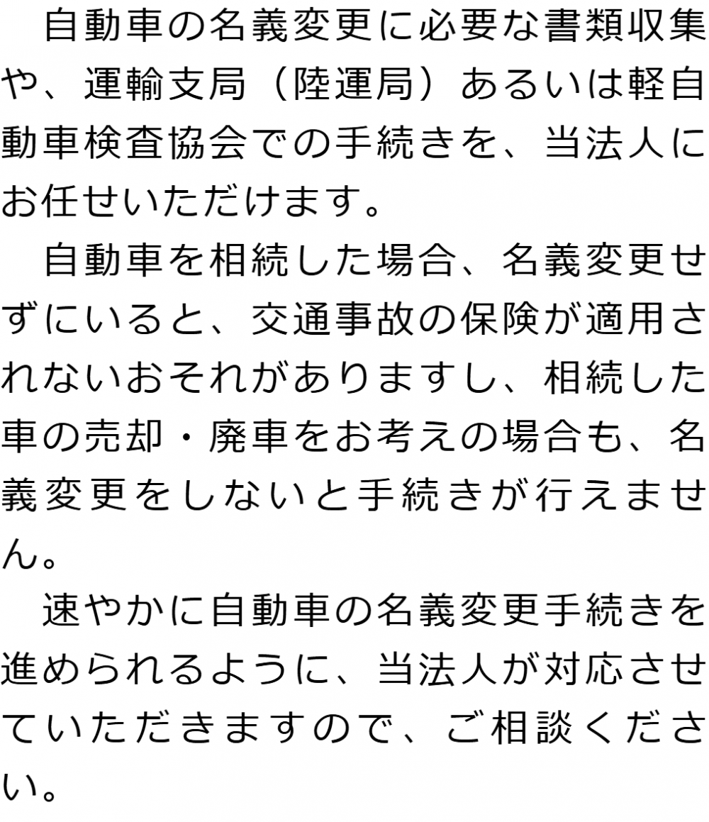 トップ業務内容自動車の名義変更 階層構造▼ 業務内容(目次) 自動車の名義変更 業務内容(目次)業務内容トップ行政書士法人心の業務内容遺言遺産整理相続人調査相続財産調査遺産分割協議書の作成預金・貯金の解約・名義変更証券口座の解約・名義変更自動車の名義変更心グループのその他の業務内容家族信託・民事信託節税対策事業承継遺言の検認相続放棄限定承認遺産分割遺留分侵害額請求相続登記相続税申告相続税調査 受付時間 平日 9時~21時、土日祝 9時~18時 夜間・土日祝の相談も対応します (要予約) 所在地 〒271-0092 千葉県松戸市松戸1281‐29京阪松戸ビル3F 0120-2403-39 お問合せ・アクセス・地図