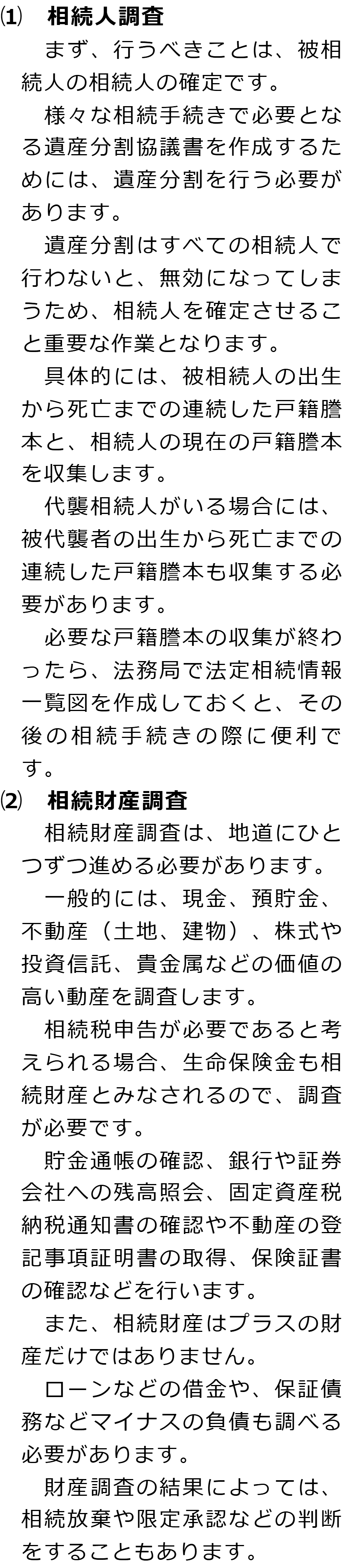 相続手続きの必要事項に関するQ&AQ相続手続きでは何をする必要がありますか?Q相続人調査と相続財産調査では何をする必要がありますか?Q遺産分割では何が必要ですか?Q相続登記はどのような場合に必要ですか?Q相続税申告はどのような場合に必要ですか? Q相続手続きでは何をする必要がありますか?AQ相続人調査と相続財産調査では何をする必要がありますか?AQ遺産分割では何が必要ですか?AQ相続登記はどのような場合に必要ですか?AQ相続税申告はどのような場合に必要ですか?A Q&A(目次)Q&Aトップ相続手続きの必要事項に関するQ&A 受付時間 平日 9時~21時、土日祝 9時~18時 夜間・土日祝の相談も対応します (要予約) 所在地 〒271-0092 千葉県松戸市松戸1281‐29京阪松戸ビル3F 0120-2403-39 お問合せ・アクセス・地図