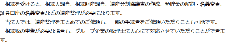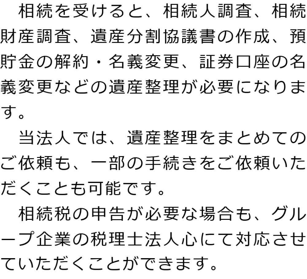 トップ業務内容遺産整理 階層構造▼ 業務内容(目次) 遺産整理 業務内容(目次)業務内容トップ行政書士法人心の業務内容遺言遺産整理相続人調査相続財産調査遺産分割協議書の作成預金・貯金の解約・名義変更証券口座の解約・名義変更自動車の名義変更心グループのその他の業務内容家族信託・民事信託節税対策事業承継遺言の検認相続放棄限定承認遺産分割遺留分侵害額請求相続登記相続税申告相続税調査 受付時間 平日 9時~21時、土日祝 9時~18時 夜間・土日祝の相談も対応します (要予約) 所在地 〒271-0092 千葉県松戸市松戸1281‐29京阪松戸ビル3F 0120-2403-39 お問合せ・アクセス・地図