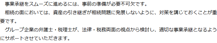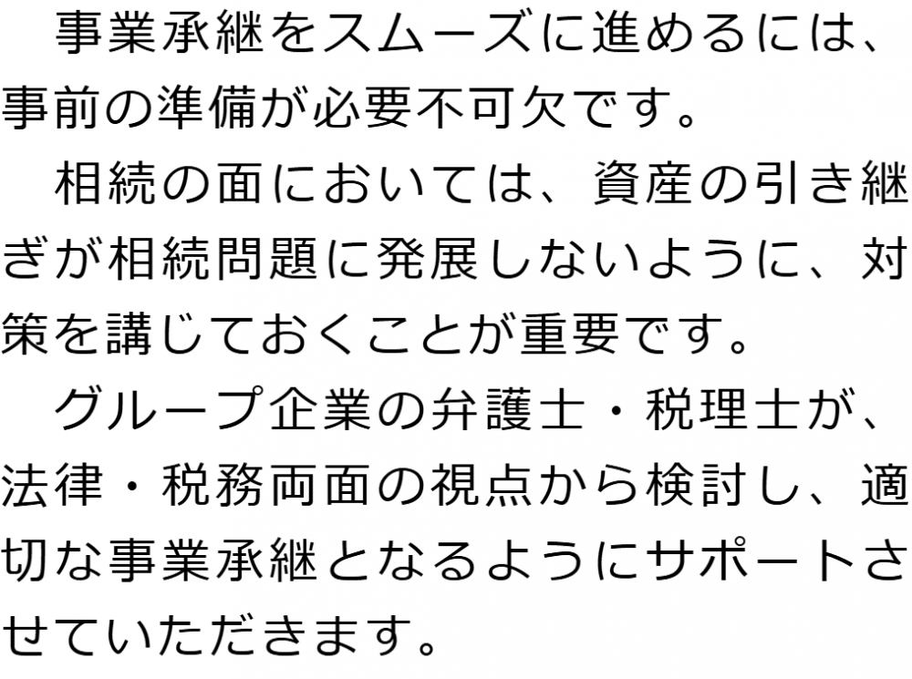 トップ業務内容事業承継 階層構造▼ 業務内容(目次) 事業承継 業務内容(目次)業務内容トップ行政書士法人心の業務内容遺言遺産整理相続人調査相続財産調査遺産分割協議書の作成預金・貯金の解約・名義変更証券口座の解約・名義変更自動車の名義変更心グループのその他の業務内容家族信託・民事信託節税対策事業承継遺言の検認相続放棄限定承認遺産分割遺留分侵害額請求相続登記相続税申告相続税調査 受付時間 平日 9時~21時、土日祝 9時~18時 夜間・土日祝の相談も対応します (要予約) 所在地 〒271-0092 千葉県松戸市松戸1281‐29京阪松戸ビル3F 0120-2403-39 お問合せ・アクセス・地図