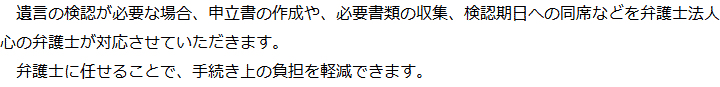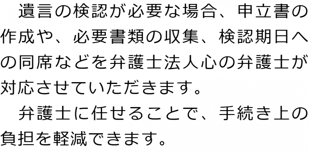 トップ業務内容遺言の検認 階層構造▼ 業務内容(目次) 遺言の検認 業務内容(目次)業務内容トップ行政書士法人心の業務内容遺言遺産整理相続人調査相続財産調査遺産分割協議書の作成預金・貯金の解約・名義変更証券口座の解約・名義変更自動車の名義変更心グループのその他の業務内容家族信託・民事信託節税対策事業承継遺言の検認相続放棄限定承認遺産分割遺留分侵害額請求相続登記相続税申告相続税調査 受付時間 平日 9時~21時、土日祝 9時~18時 夜間・土日祝の相談も対応します (要予約) 所在地 〒271-0092 千葉県松戸市松戸1281‐29京阪松戸ビル3F 0120-2403-39 お問合せ・アクセス・地図