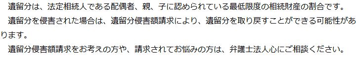 トップ業務内容遺留分侵害額請求 階層構造▼ 業務内容(目次) 遺留分侵害額請求 業務内容(目次)業務内容トップ行政書士法人心の業務内容遺言遺産整理相続人調査相続財産調査遺産分割協議書の作成預金・貯金の解約・名義変更証券口座の解約・名義変更自動車の名義変更心グループのその他の業務内容家族信託・民事信託節税対策事業承継遺言の検認相続放棄限定承認遺産分割遺留分侵害額請求相続登記相続税申告相続税調査 受付時間 平日 9時~21時、土日祝 9時~18時 夜間・土日祝の相談も対応します (要予約) 所在地 〒271-0092 千葉県松戸市松戸1281‐29京阪松戸ビル3F 0120-2403-39 お問合せ・アクセス・地図